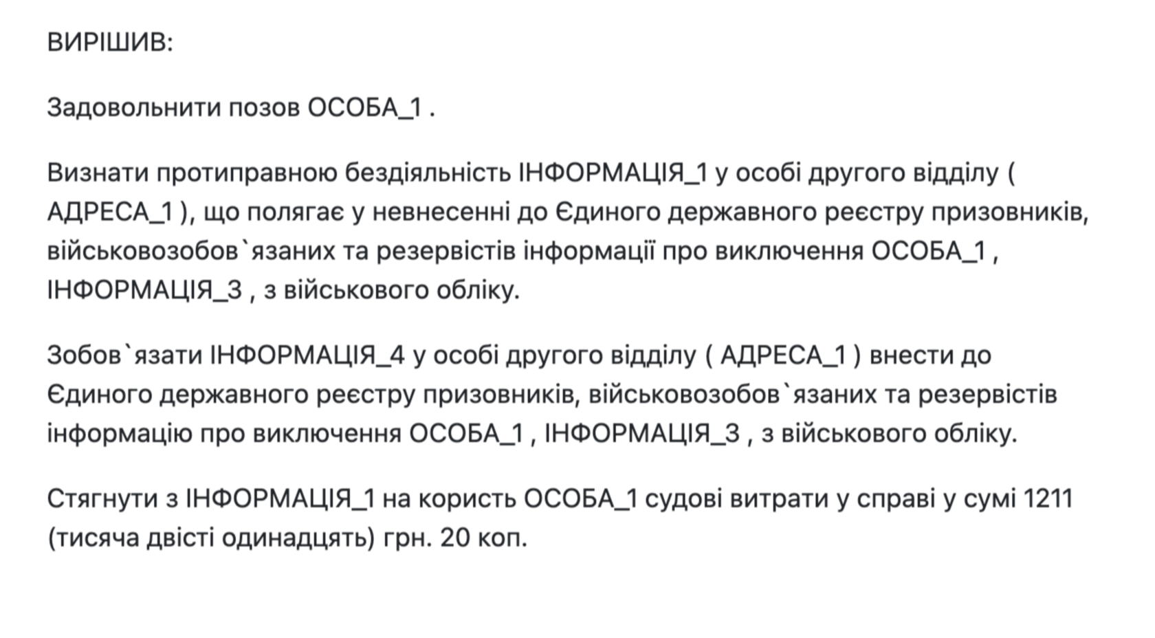- Обязать ответчика внести эти сведения в Единый государственный реестр призывников, военнообязанных и резервистов и реестра "Оберіг".