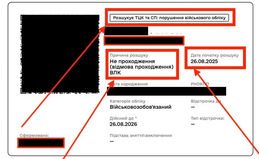 В случае, если вы находитесь в розыске ТЦК, вы увидите следующую информацию: