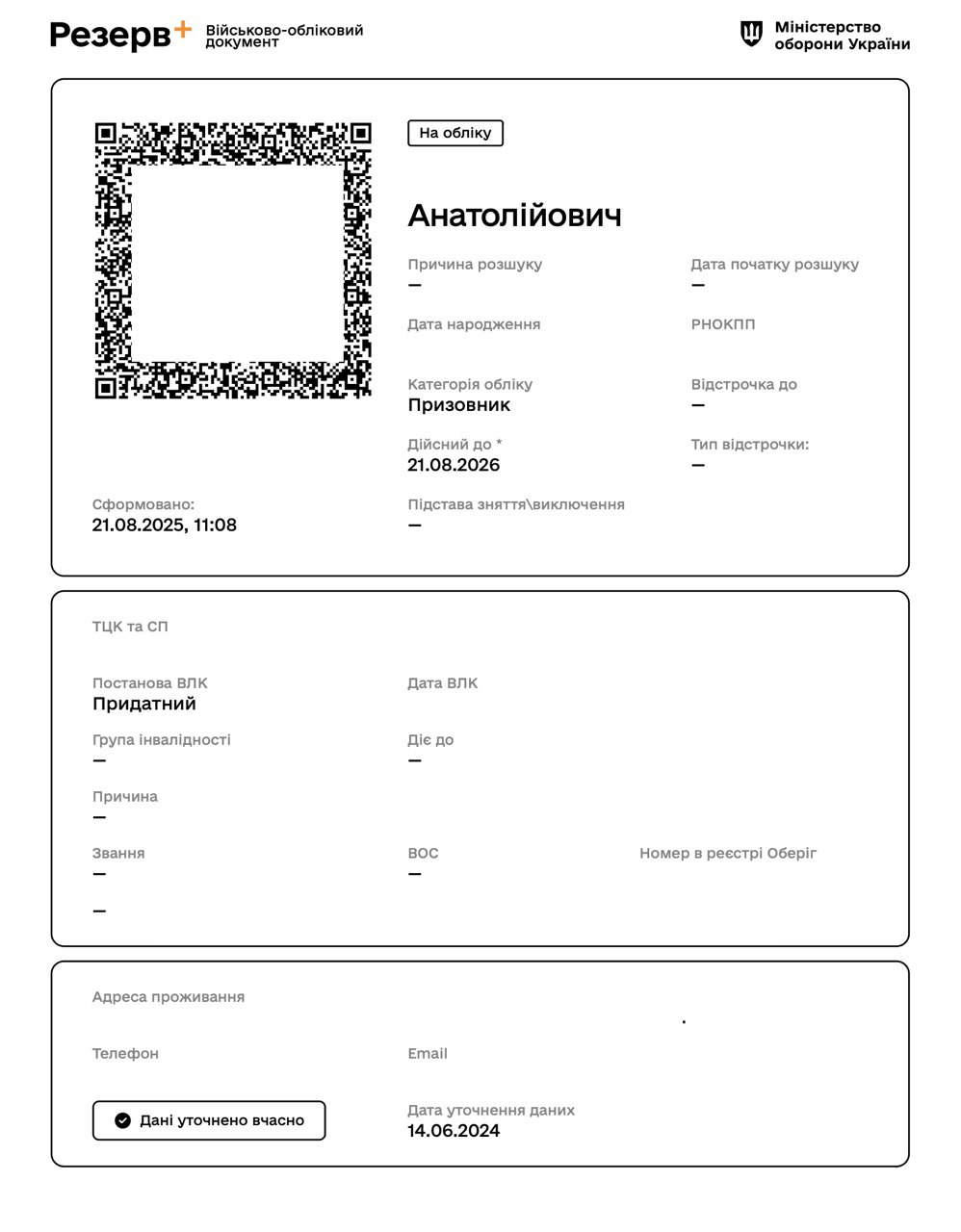 Уточнение персональных данных. В соответствии с правилами военного учета мужчины обязаны своевременно уточнять военно-учетные данные и сообщать ТЦК об изменении персональных данных. Мобильное приложение Резерв+ позволяет сообщить об изменении таких данных онлайн и без посещений ТЦК и СП.