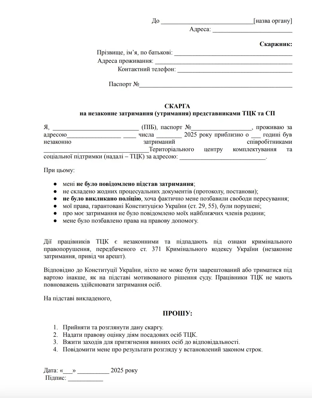 Затем следует отметить конкретную ситуацию и возникшие нарушения. Например: Я, ___________________________ (ФИО), паспорт №___________________, проживаю по адресу_________________ ____ числа ________ 2025 года примерно в ___ часов был незаконно задержан сотрудниками _________________________________Территориального центра комплектования и социальной поддержки (далее – ТЦК) по адресу: ___________________________.