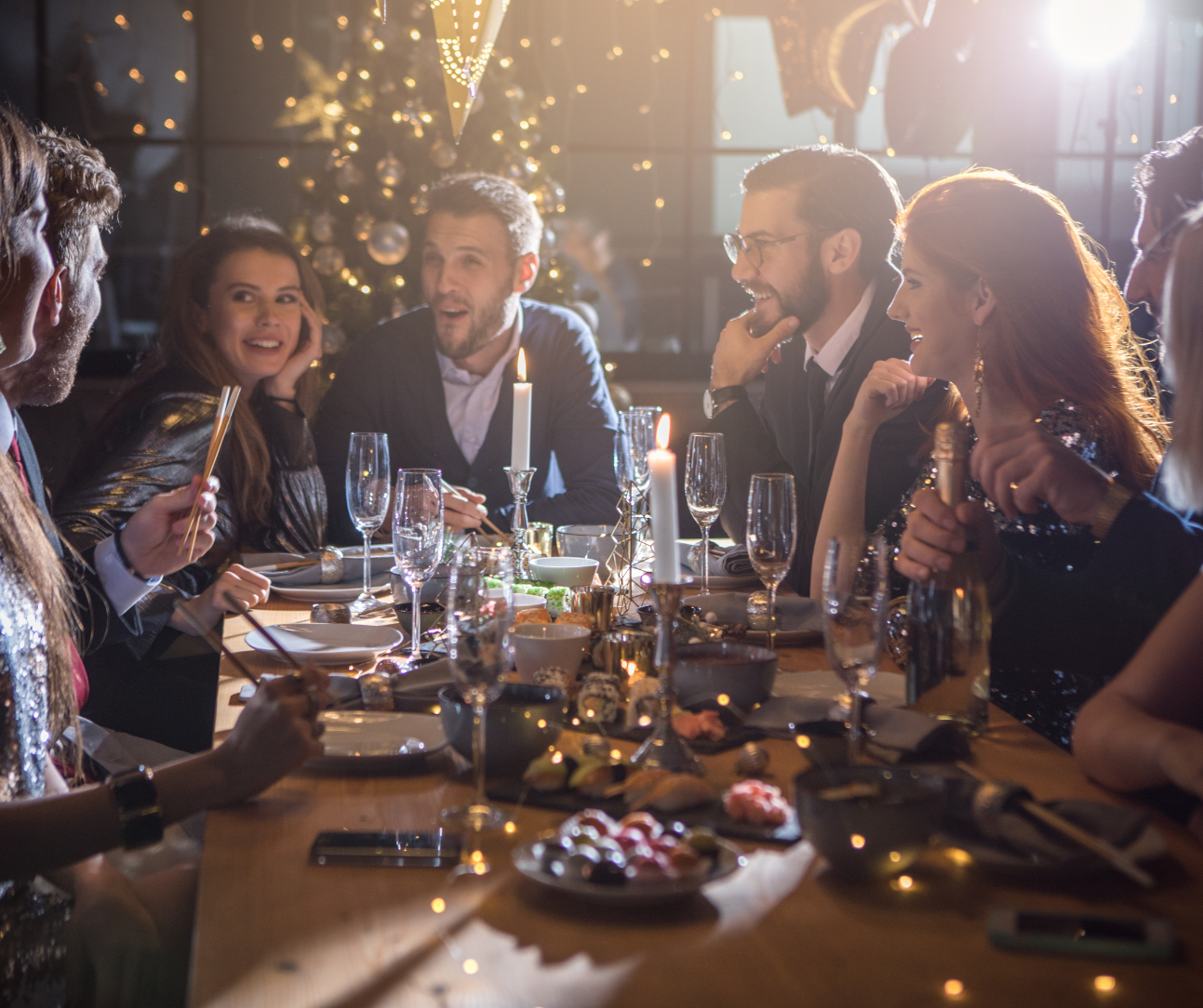 Це вже класика. Якщо вам хочеться одягнути гарні вечірні наряди, стати частиною новорічної програми із ведучим і запрошеними гостями, чи навіть співаками та іншими зірками - варто обрати цей вид святкування. Зазвичай такі корпоративи та бенкети організовують ресторани, компанії, чи готелі. Це веселий спосіб зустріти новий рік в шумній компанії та познайомитися із новими людьми. Тут варто подбати про дорогу додому, або ж обрати готельний номер поруч, щоб після такої шаленої вечірки гарненько відпочити.