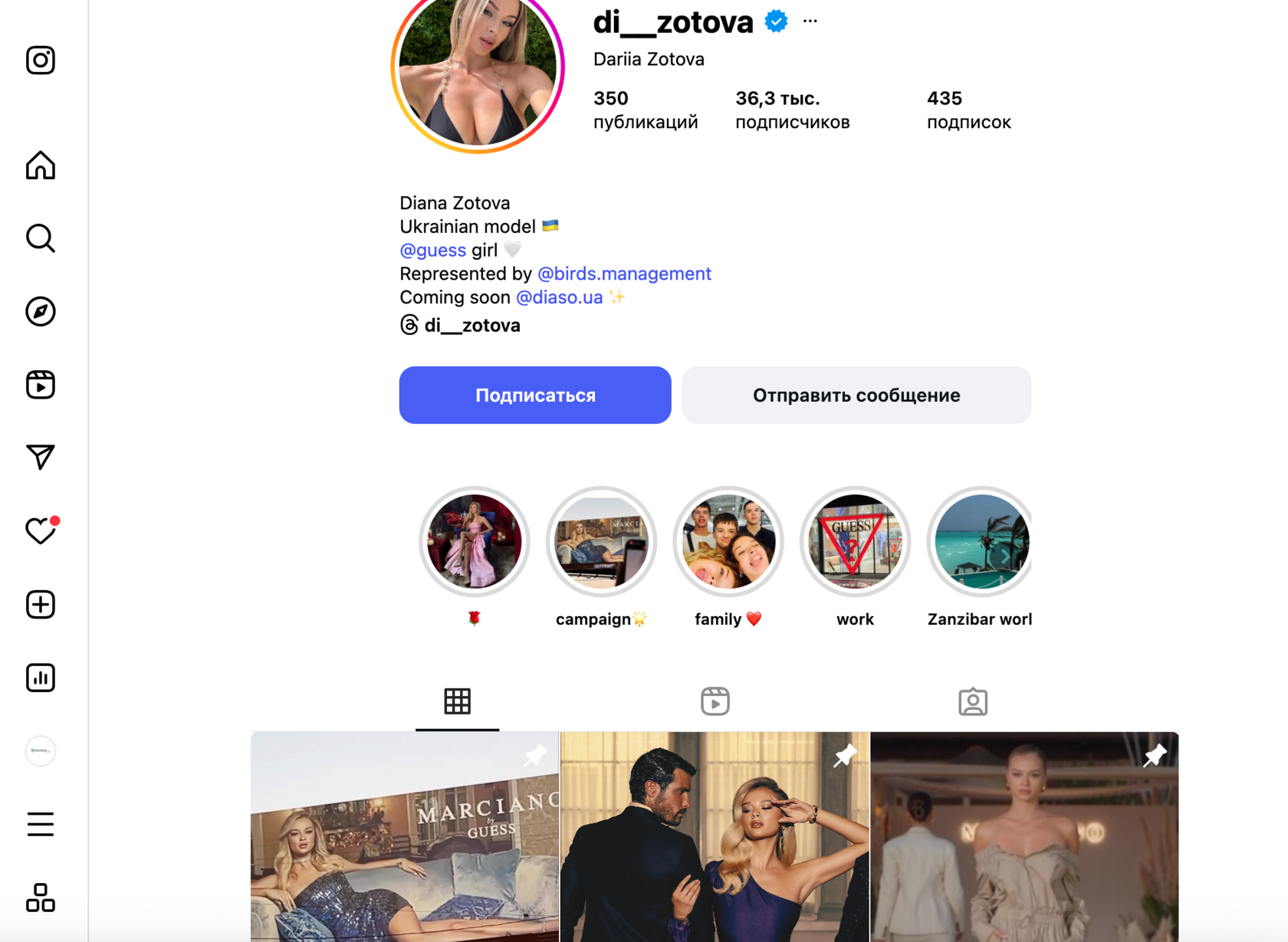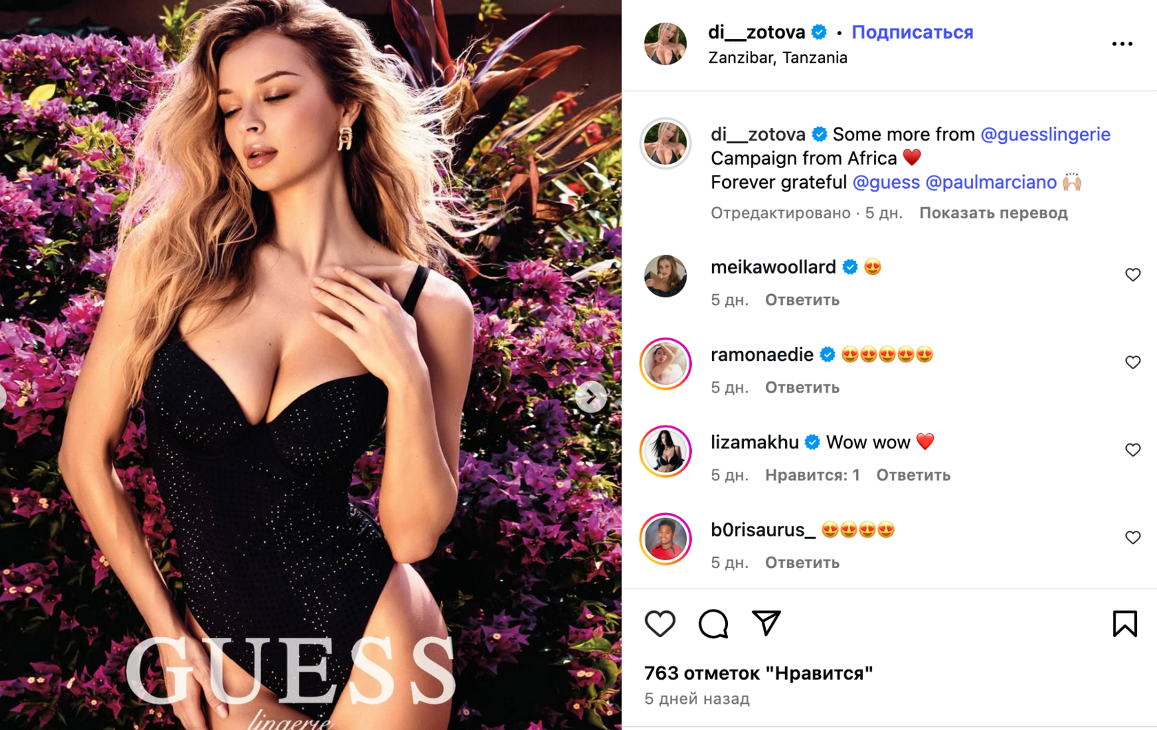 Модель Діана постійно знімається для бренду, такого як GUESS, що також підтверджує її соціальна сторінка де міститься декілька публікації з постером.