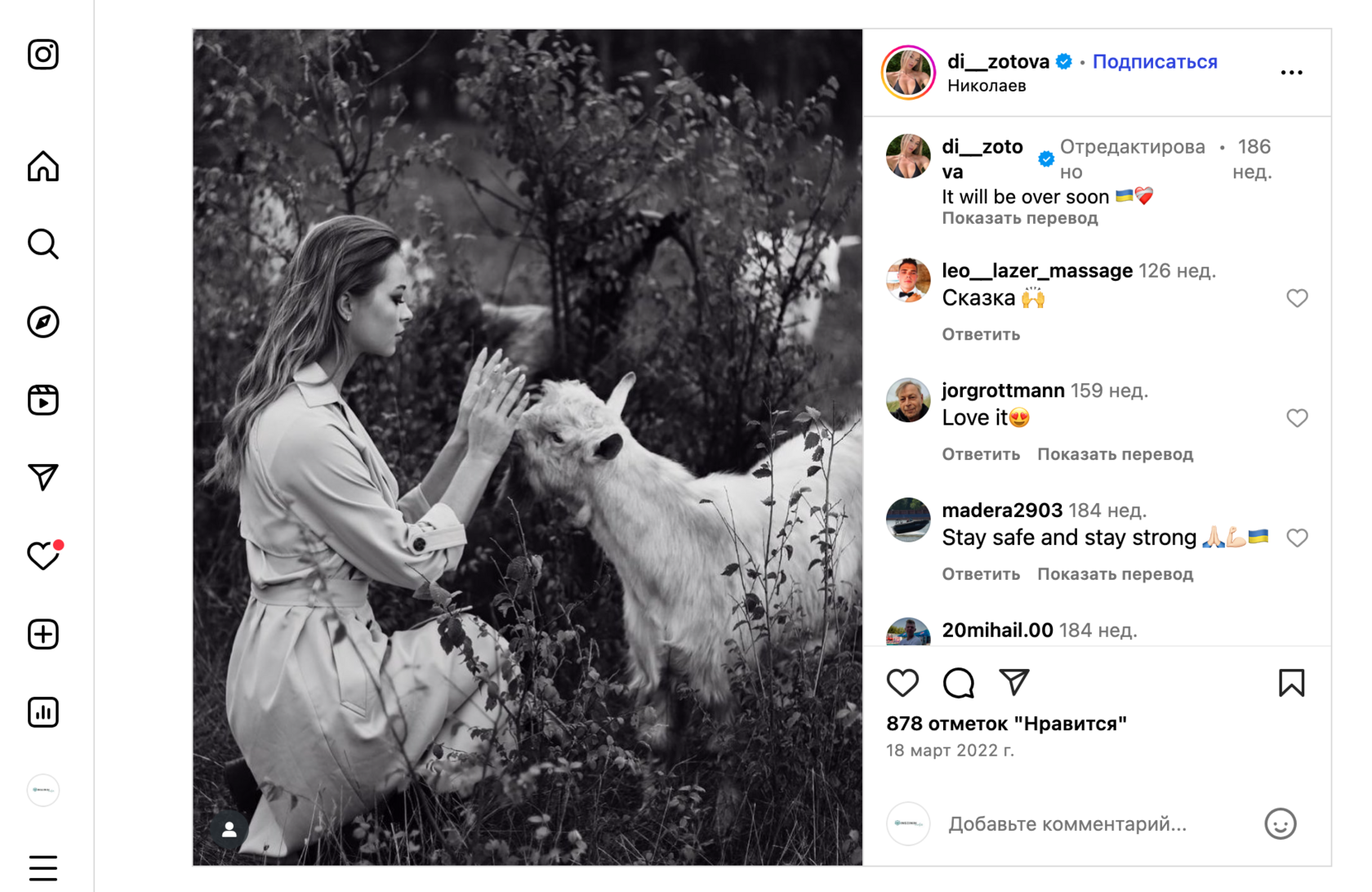 Діана Золотова має інстаграм на понад 30 тис. підписників, постійно подорожує, публікує фото для фанатів та читачів. Раніше публікувала пости російською мовою, але після повномаштабного публікації було видалено, так стверджує блогер Беспалов.