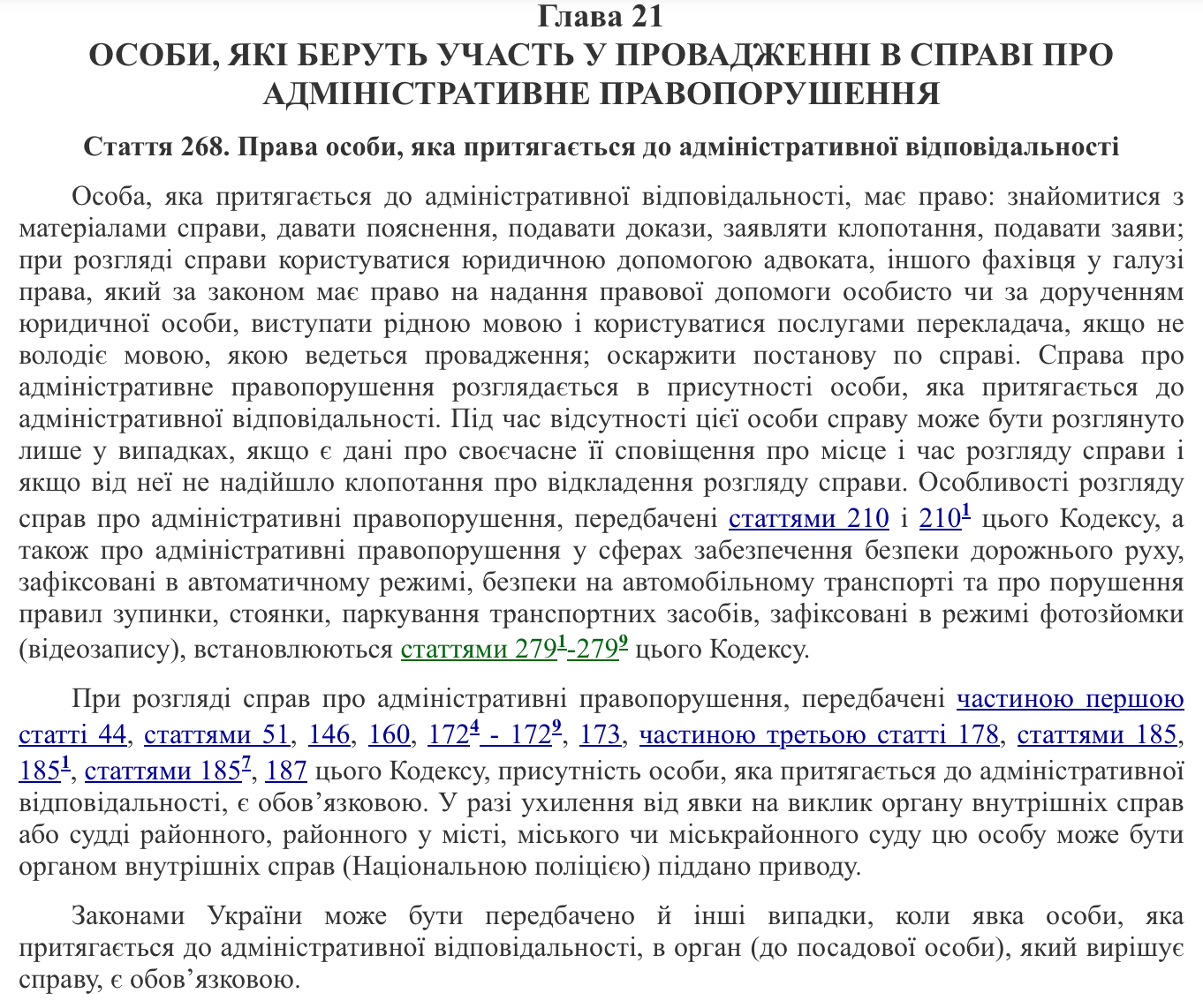 Стаття 268 КУПАП "про Права особи що притягається до адміністравної віповідальності"