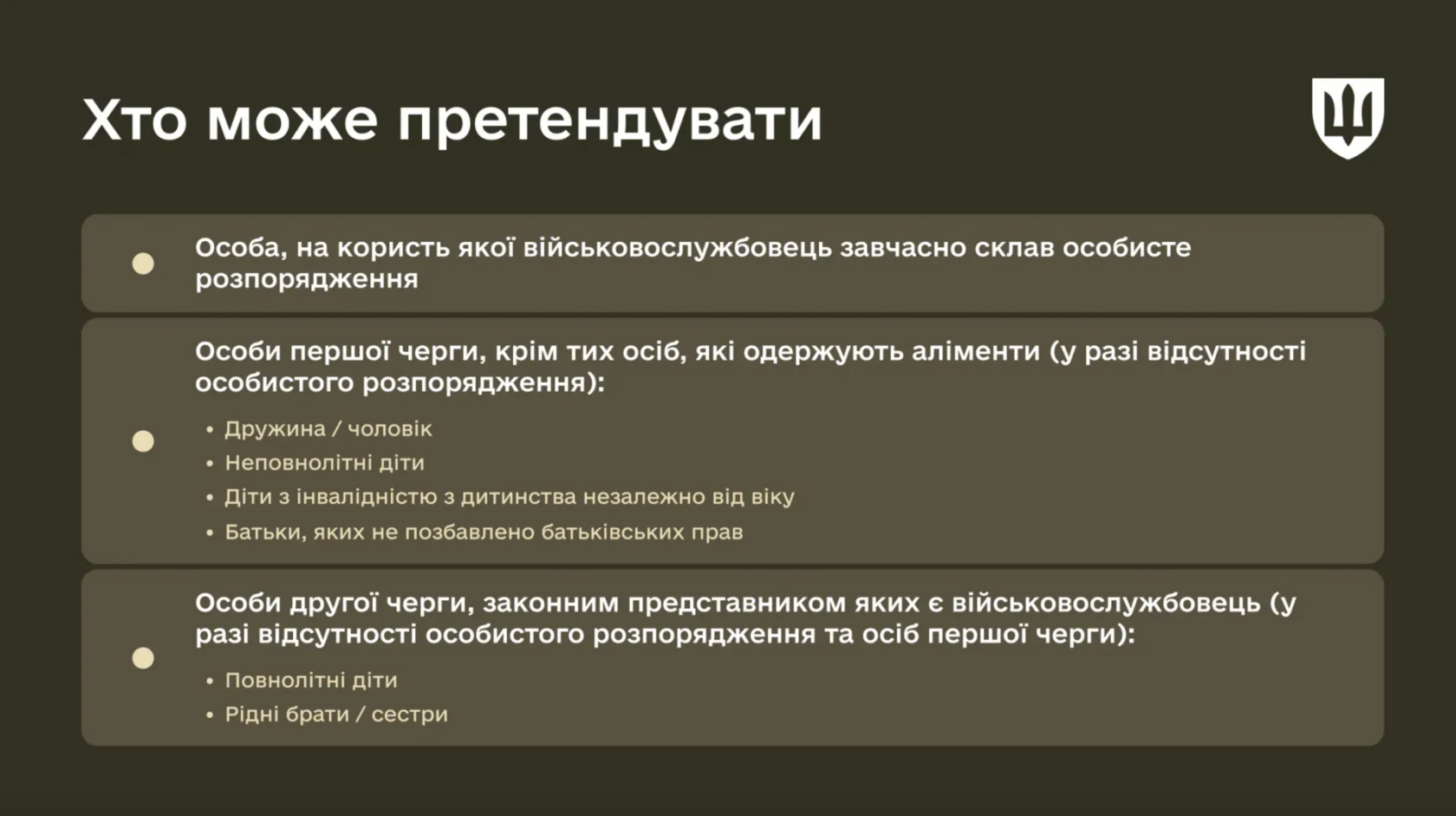 Законодавством визначається 3 випадки та кола осіб, які будуть мати право на виплату у разі, якщо військовослужбовець зникне безвісти: