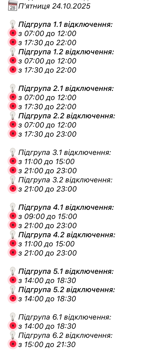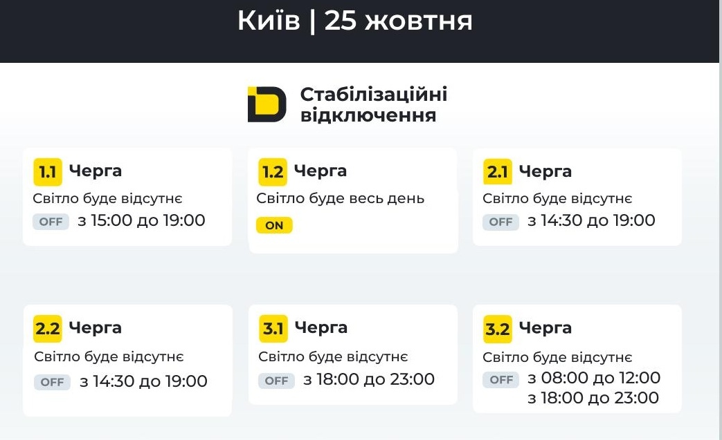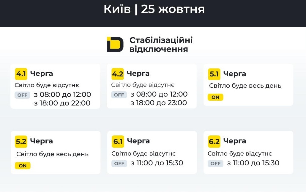 ⚠️ Графіки стабілізаційних відключень світла у Києві для груп 1, 2, 3, 4, 5, 6 на 22, 23, 24, 25, 26 жовтня