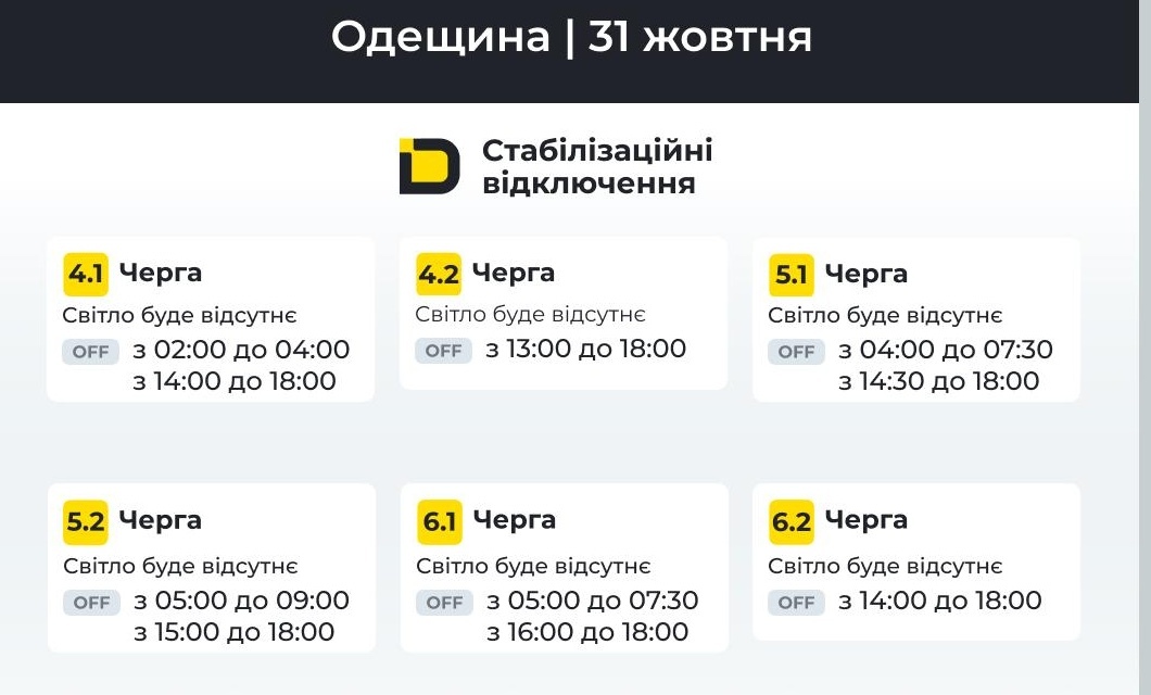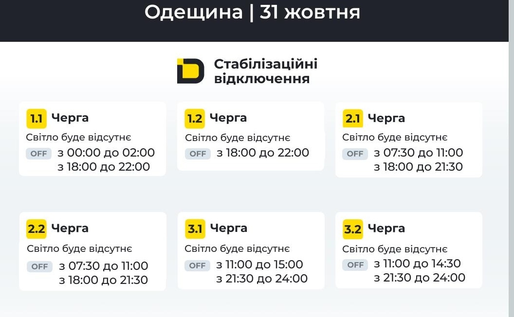 Компанія ДТЕК Одеські електромережі, як ключовий оператор у регіоні, продовжує впроваджувати стабілізаційні графіки відключень (ГПВ), аби зберегти баланс у національній енергосистемі. Ці графіки на 30 та 31 Жовтня розраховані на максимальну тривалість одного відключення до 7 годин, але в реальності вони можуть коригуватися залежно від аварійних ситуацій чи команд від НЕК "Укренерго".