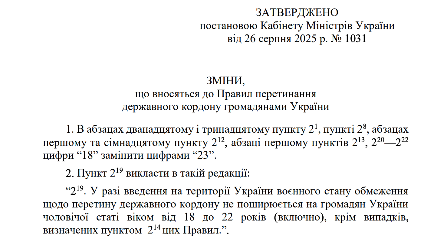 Текст Постанови від 26 серпня 2025 р. № 1031 Кабінету Міністрів України про виїзд закордон 18-22 роки