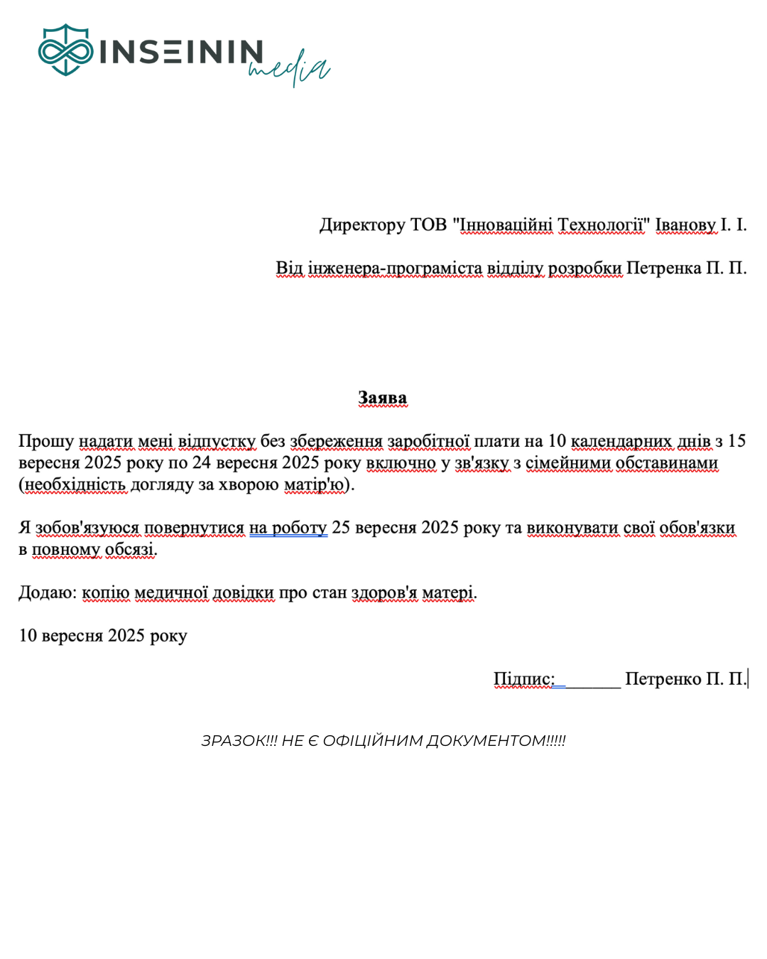 Прошу надати мені відпустку без збереження заробітної плати на 10 календарних днів з 15 вересня 2025 року по 24 вересня 2025 року включно у зв'язку з сімейними обставинами (необхідність догляду за хворою матір'ю).