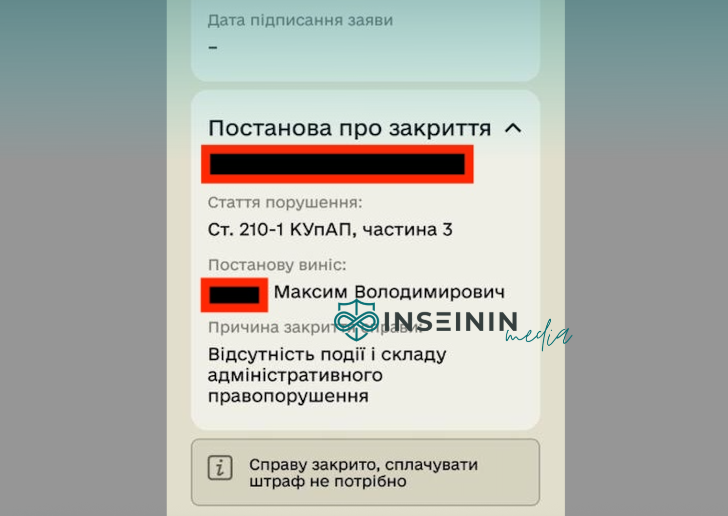 - Постанова про адмінпровадження: Номер № від 2025 це дата винесення постанови, але в інтересах військовозобовʼязаного по спливу строку справу закрито і штраф не накладено, бо справа в процесі була закрита без притягнення до відповідальності порушника.