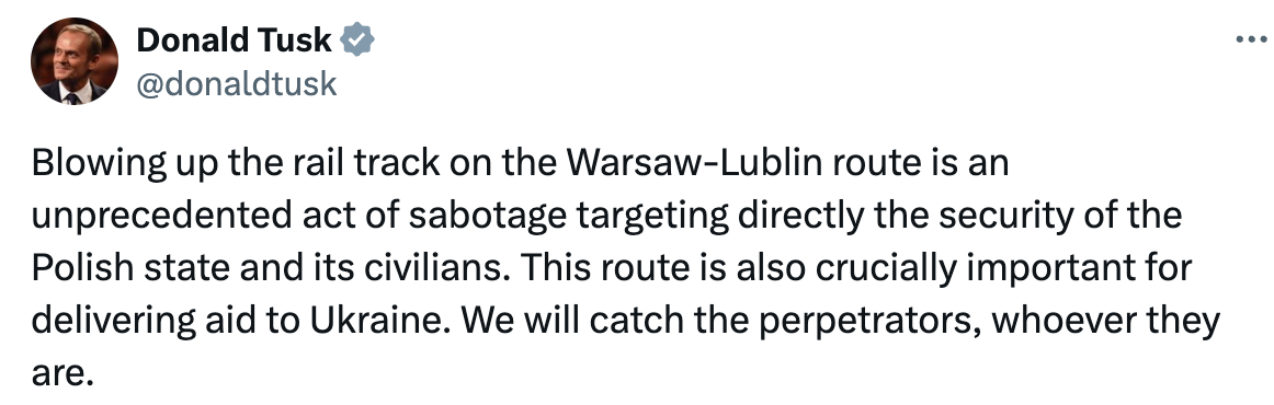 "Підрив залізничного полотна на лінії Варшава-Люблін – безпрецедентний акт саботажу, спрямований безпосередньо проти безпеки польської держави та її громадян. Цей маршрут також є критично важливим для доставки гуманітарної допомоги в Україну. Ми спіймаємо винних, ким би вони не були." - Пише у Х ТУСК, премʼєр Польщі.