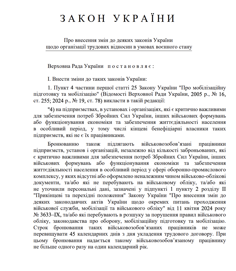 Презилентом України 31.10.2025 року було підписано Законопроект №13335. Це означає, що після набуття ним законної сили буде розширено коло військовозобовʼязаних чоловіків, яких можна буде забронювати за підприємством.