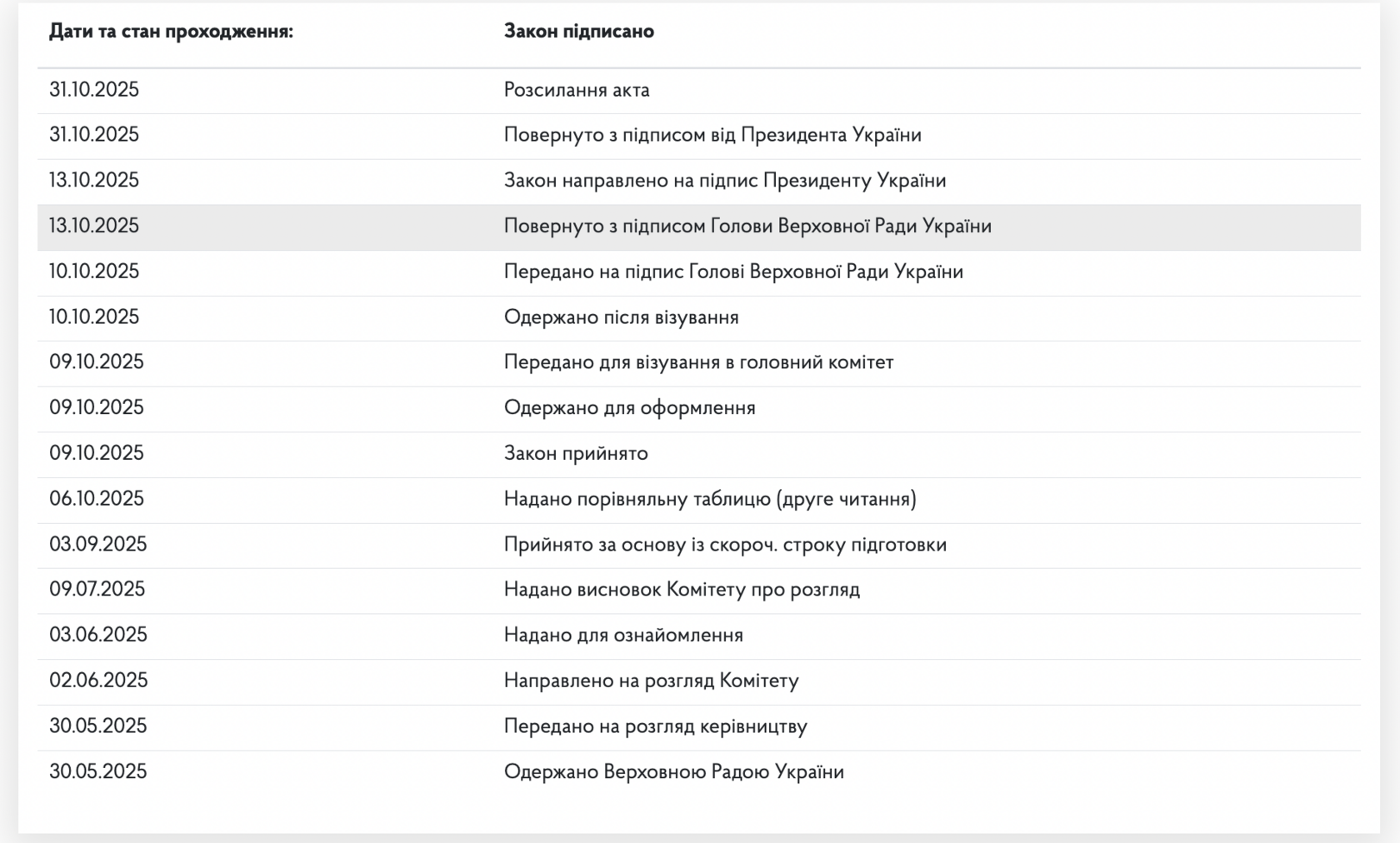 Закон набирає чинності через один місяць з дня, наступного за днем його опублікування. Опублікування закону зазвичай відбувається на наступний день після підписання президентом. Це означає, зо приблизно з 1 грудня 2025 року закон має набути законної сили.