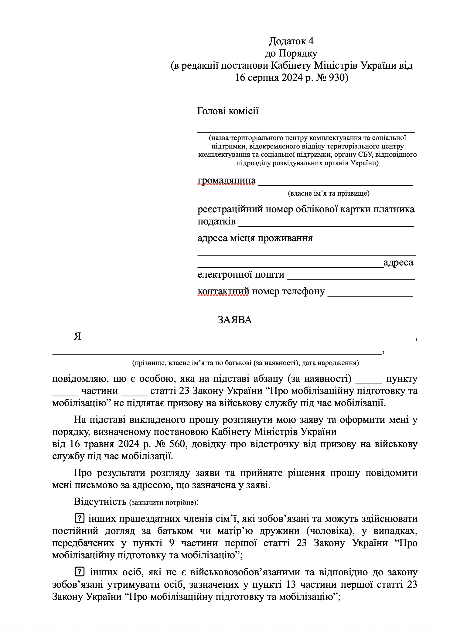Кабінетом Міністрів України було прийнято постанову №1364, якою вносяться зміни до порядку оформлення відстрочки від мобілізації в період дії воєнного стану. Основні зміни полягають в тому, що відтепер оформити відстрчоку можливо лише шляхом подачі заявки через застосунок Резерв+ або до ЦНАПу.