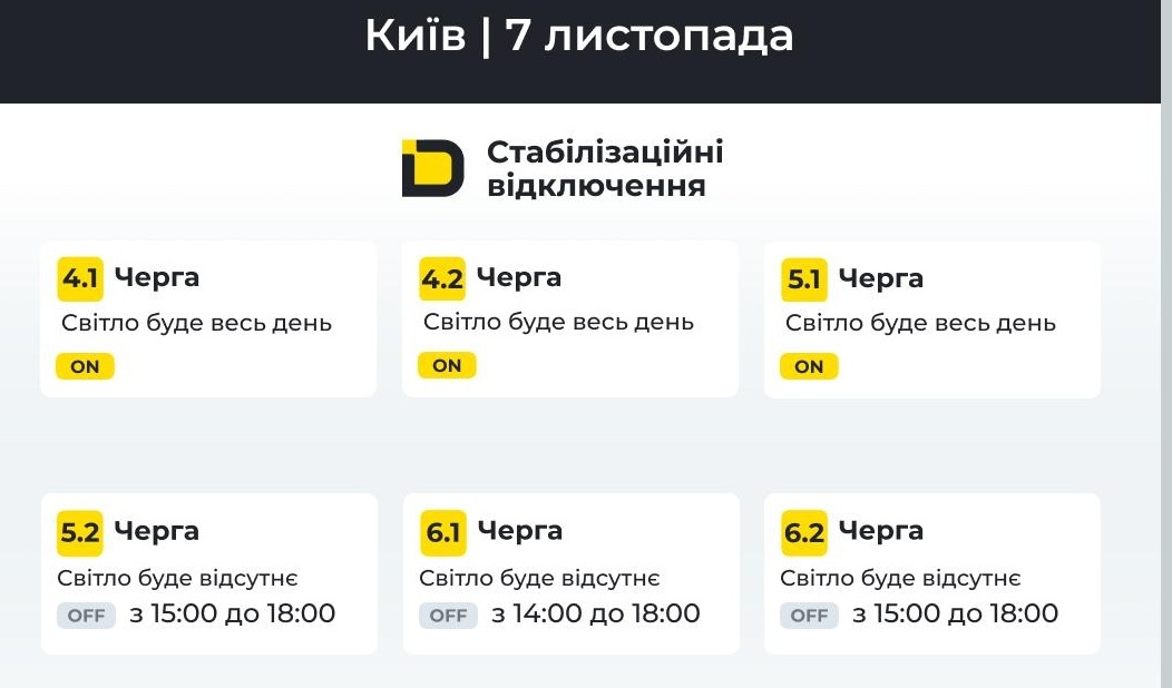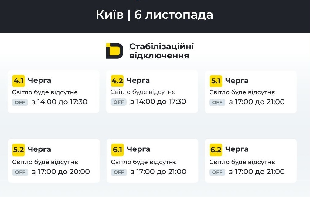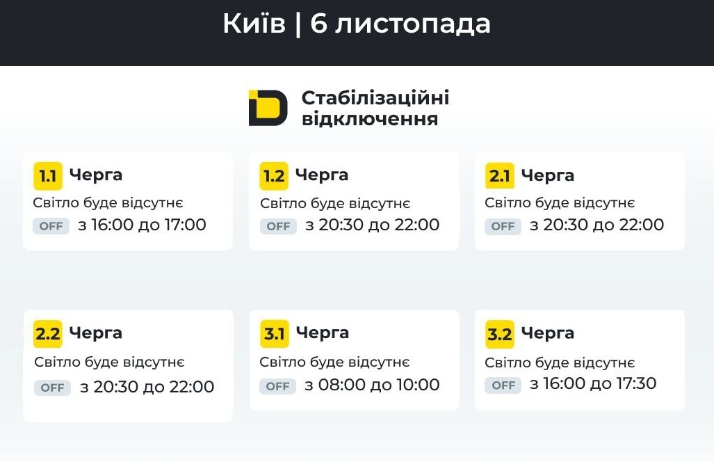 Графік відключення світла Київ 6, 7, 8, 9, 10, 11 Листопада