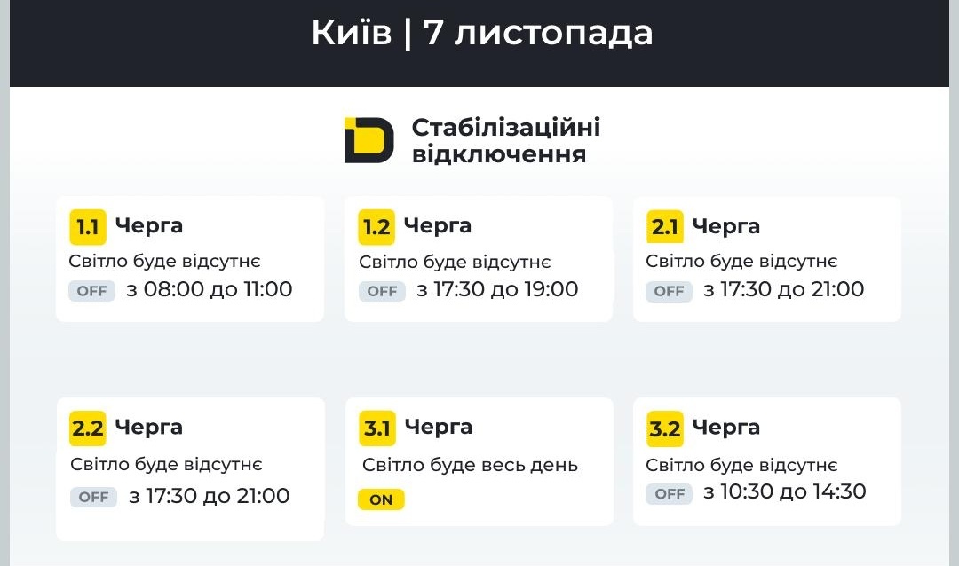 У листопаді 2025 року ці графіки запроваджують і змінюють залежно від загального стану мережі, нічних обстрілів енергетичної інфраструктури в інших областях та температури за вікном. Через похолодання наруга на електро мережу Києва продовжує зростати, система не витримує. Слідкуйте за оновленнями цієї статті, щодня та діліться нею з друзями чи сусідами. А ми в команді INSEININ Media будемо робити усе, аби ви завжди могли знати про час світла у вашій оселі. Бережіть себе та енергію!