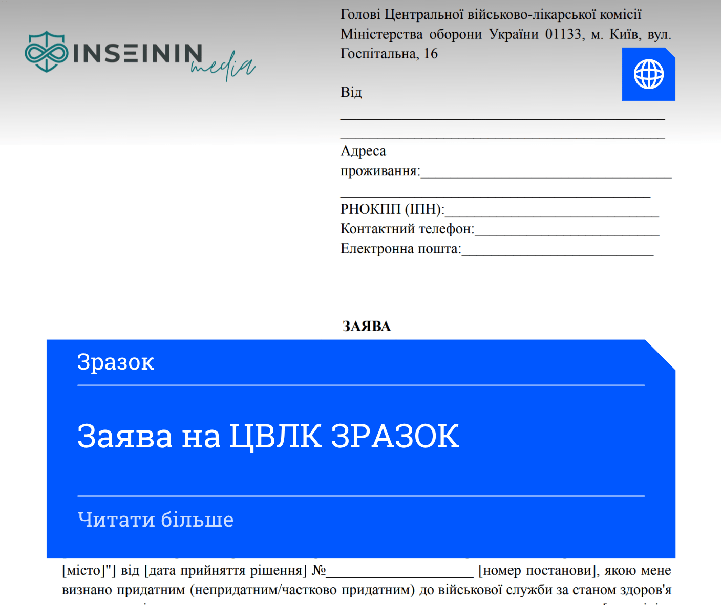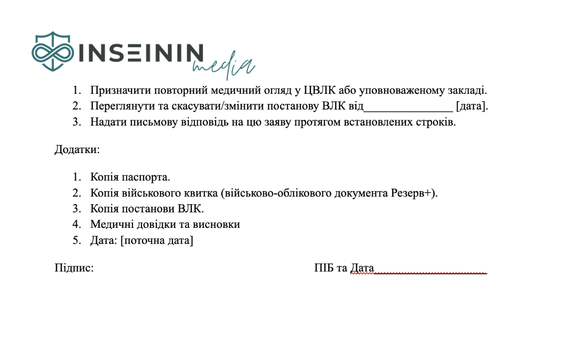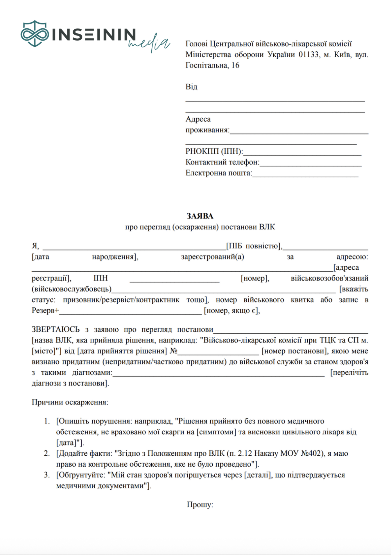 Заява на Центральну військово-лікарську комісію (ЦВЛК) — це офіційний документ, який подається для оскарження рішення або висновку нижчестоящої військово-лікарської комісії (ВЛК). Вона використовується військовозобов'язаними, призовниками, військовослужбовцями чи резервістами, які не згодні з оцінкою свого медичного стану, придатності до військової служби чи іншими медичними висновками ВЛК. Процедура регулюється Положенням про військово-лікарську експертизу в Збройних Силах України (наказ Міноборони № 402 від 14.08.2008, зі змінами), а також Законом "Про звернення громадян".