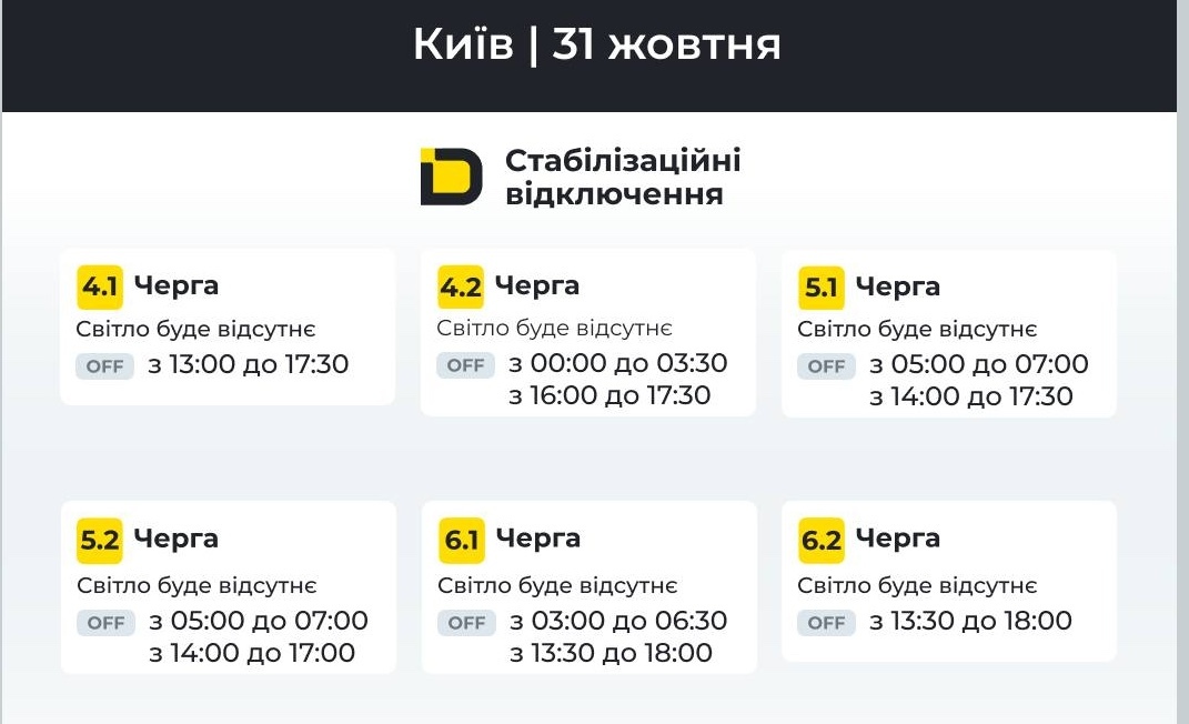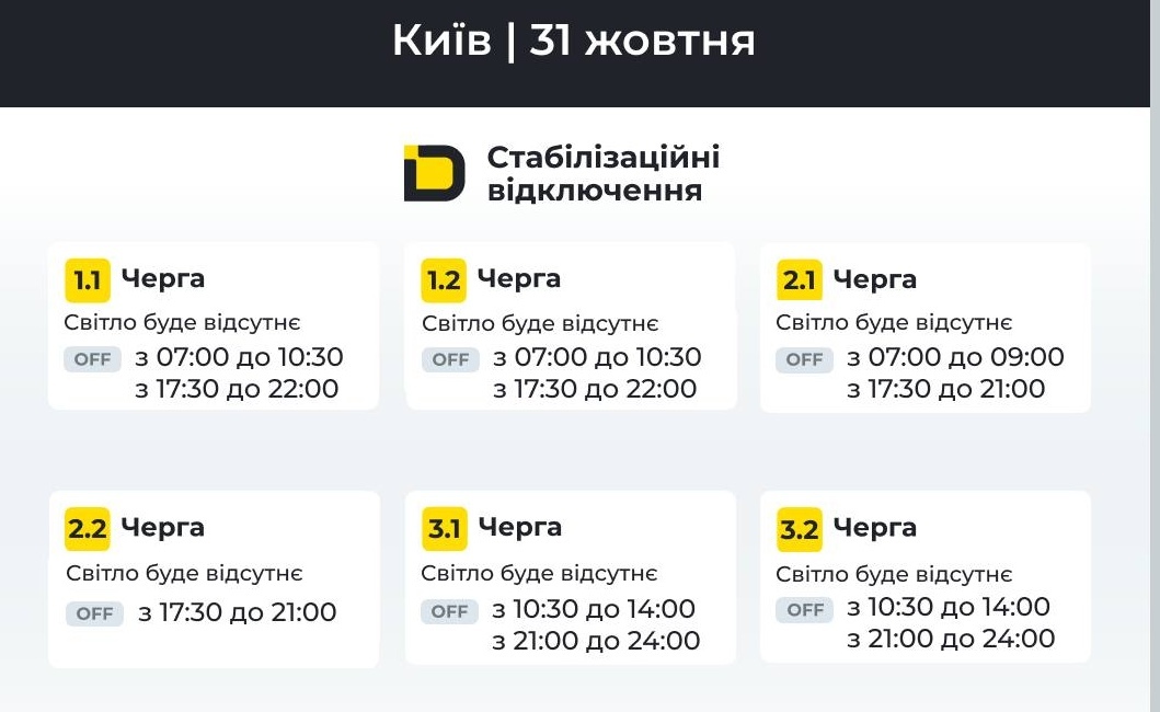 ⚠️ Офіційного графіка на 31 жовтня ще немає. За практикою ДТЕК, графік повторюється кожні 3 дні. 🔄 Очікуваний цикл: 31 жовтня = 29 жовтня (черги 1.1–3.2)