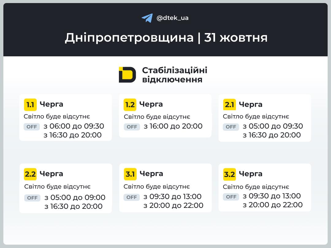 Шановні жителі Дніпропетровської області! ⚡ У зв'язку з плановими роботами та обмеженнями в енергосистемі ДТЕК оновив графік відключень електроенергії на 27, 28, 29, 30 та 31 жовтня 2025 року.