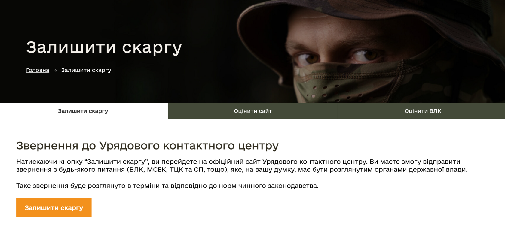 Крім телефонного зв’язку, платформа "Турбота" пропонує можливість подати скаргу онлайн через сайт. Це особливо зручно для тих, хто не може зателефонувати в робочий час. На зображенні нижче видно кнопку "Залишити скаргу", яка спрямовує до відповідного розділу з подачі Заяви скарги на дії ТЦК та СП онлайн.