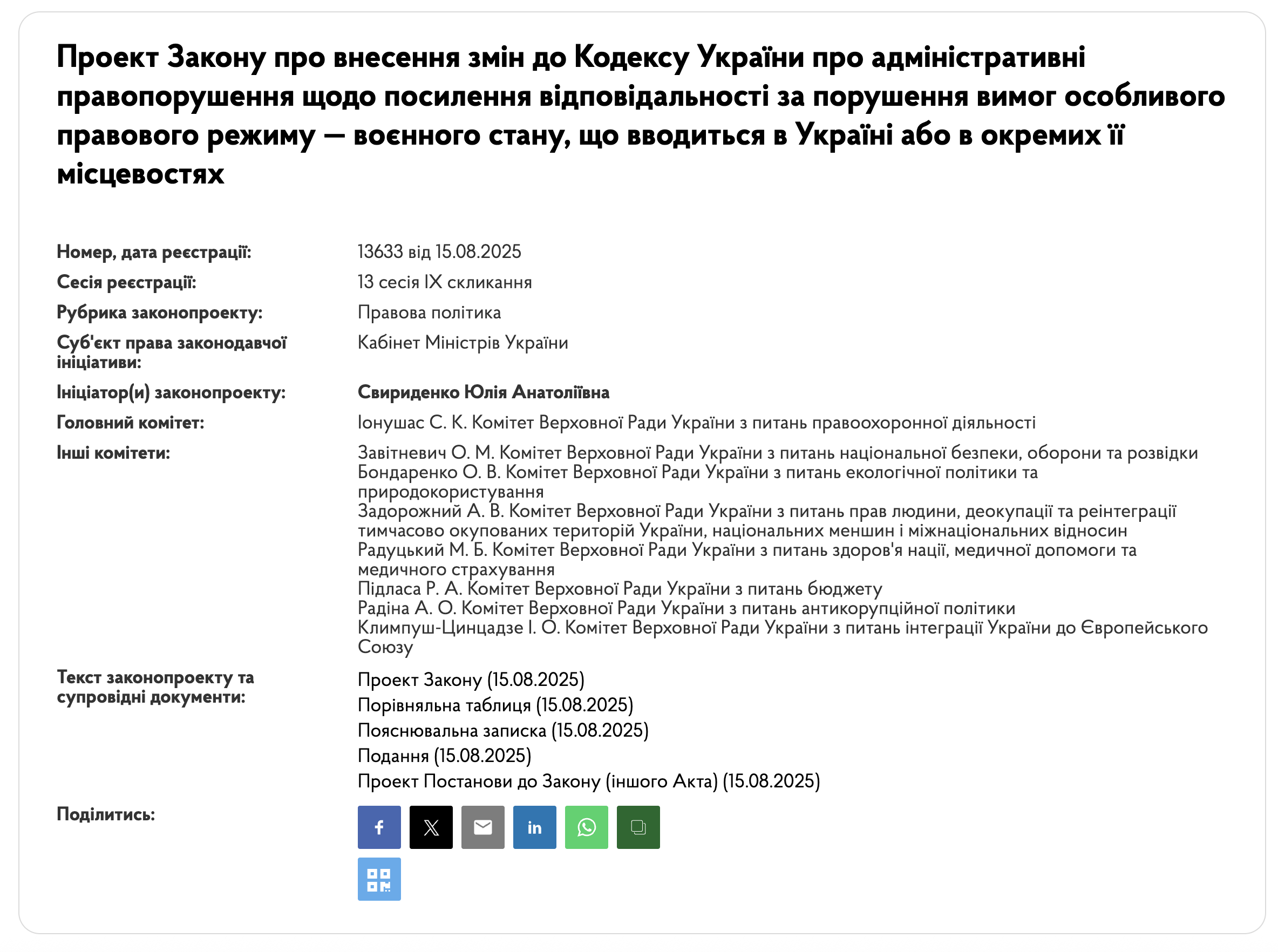 Кабінет Міністрів України пропонує запровадити адміністративну відповідальність за порушення громадянами вимог стосовно правового режиму воєнного стану та дотримання комендантської години. На розгляд народним депутатам було надано законопроект №13633 від 15.08.2025, яким передбачається внести зміни до Кодексу України про адміністративні правопорушення.