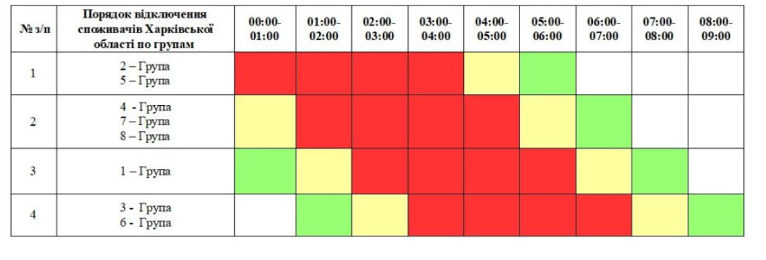 Нижче наведено графік відключення світла у Харківської області станом на листопад місяць 2025 року.