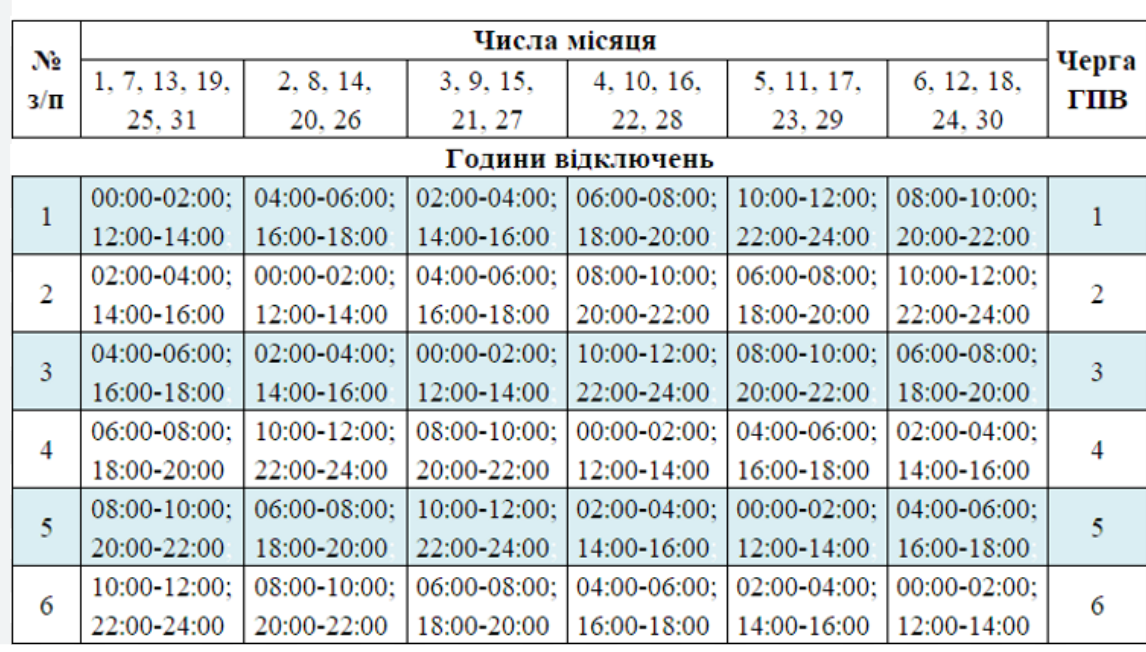 Нижче наведено графік відключення світла у Дніпропетровської області станом на листопад місяць 2025 року.