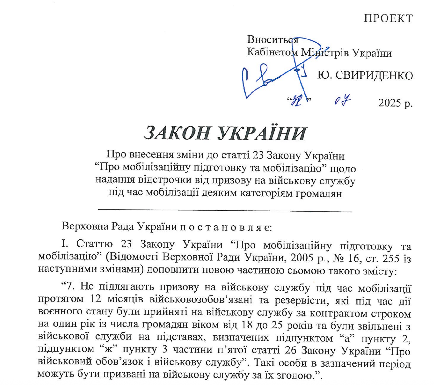 “7. Не підлягають призову на військову службу під час мобілізації протягом 12 місяців військовозобов’язані та резервісти, які під час дії воєнного стану були прийняті на військову службу за контрактом строком на один рік із числа громадян віком від 18 до 25 років та були звільнені з військової служби на підставах, визначених підпунктом “а” пункту 2, підпунктом “ж” пункту з частини п’ятої статті 26 Закону України “Про військовий обов’язок і військову службу”. Такі особи в зазначений період можуть бути призвані на військову службу за їх згодою.”.