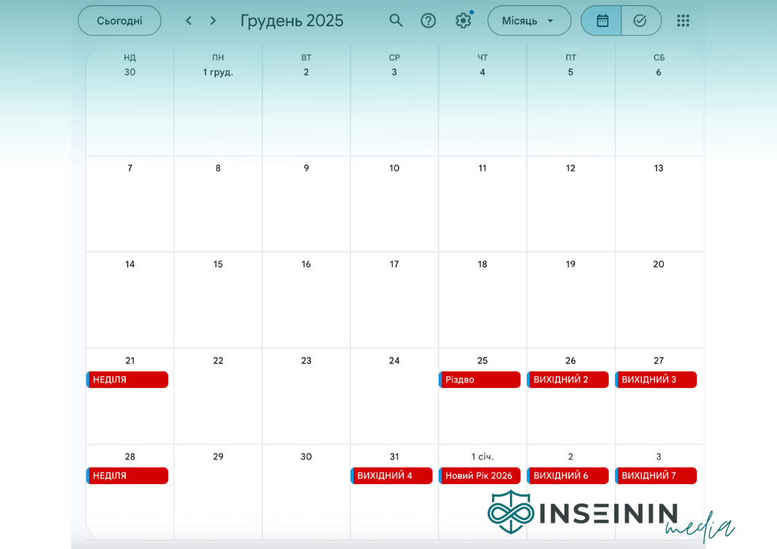 Порада від ІНСЕІНІН: Не соромтеся запитати у свого HR чи керівника про графік вже зараз. Це дозволить вам спланувати поїздку до рідних або просто забронювати той самий столик в улюбленому закладі.