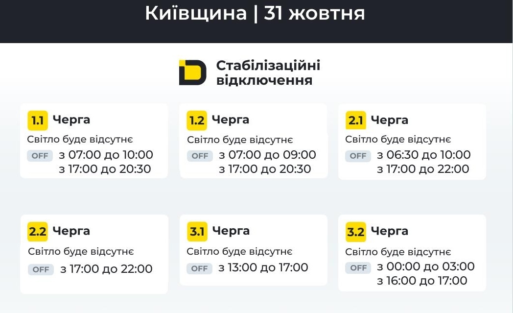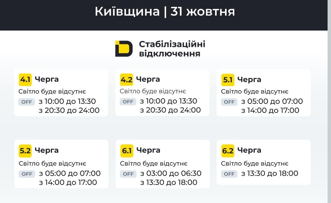 За розкладом Стабілізаційних відключень у Київській області від ДТЕК, що поділений на групи споживачів (від 1 до 6 групи), загалом у кожної групи світло буде відсутнє по 2-3 години зранку та ввечері 29 жовтня. Кожна група має підгрупи (наприклад, 1.1 та 1.2), які визначають точний час можливих відключень світла на Київщині, що коригується від 1,5 години до 3,5 годин на день зранку або ввечері.