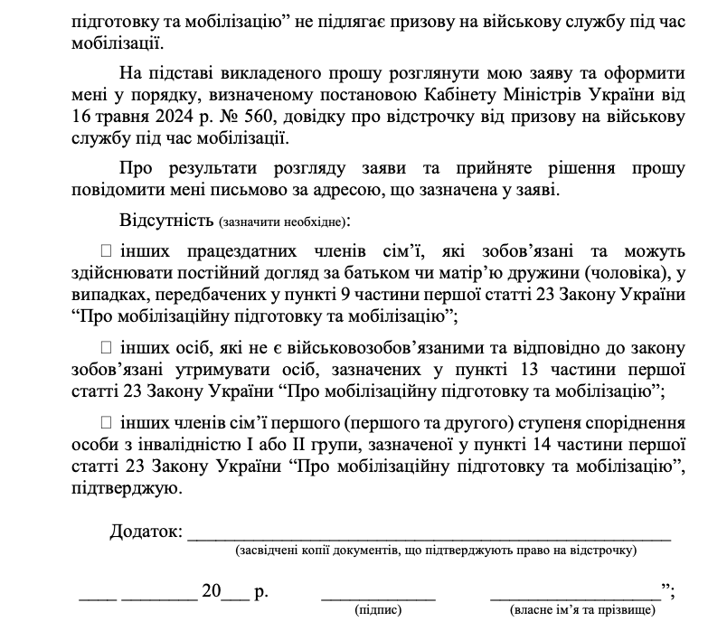 “58. За наявності підстав для одержання відстрочки від призову на військову службу під час мобілізації, на особливий період військовозобов’язані (крім заброньованих та посадових (службових) осіб, зазначених у підпунктах 16—23 пункту 1 додатка 5, військовозобов’язаних СБУ чи розвідувальних органів) особисто через центри надання адміністративних послуг подають на ім’я голови комісії районного (міського) територіального центру комплектування та соціальної підтримки або його відділу за місцем перебування на військовому обліку заяву про надання відстрочки від призову на військову службу під час мобілізації, на особливий період.