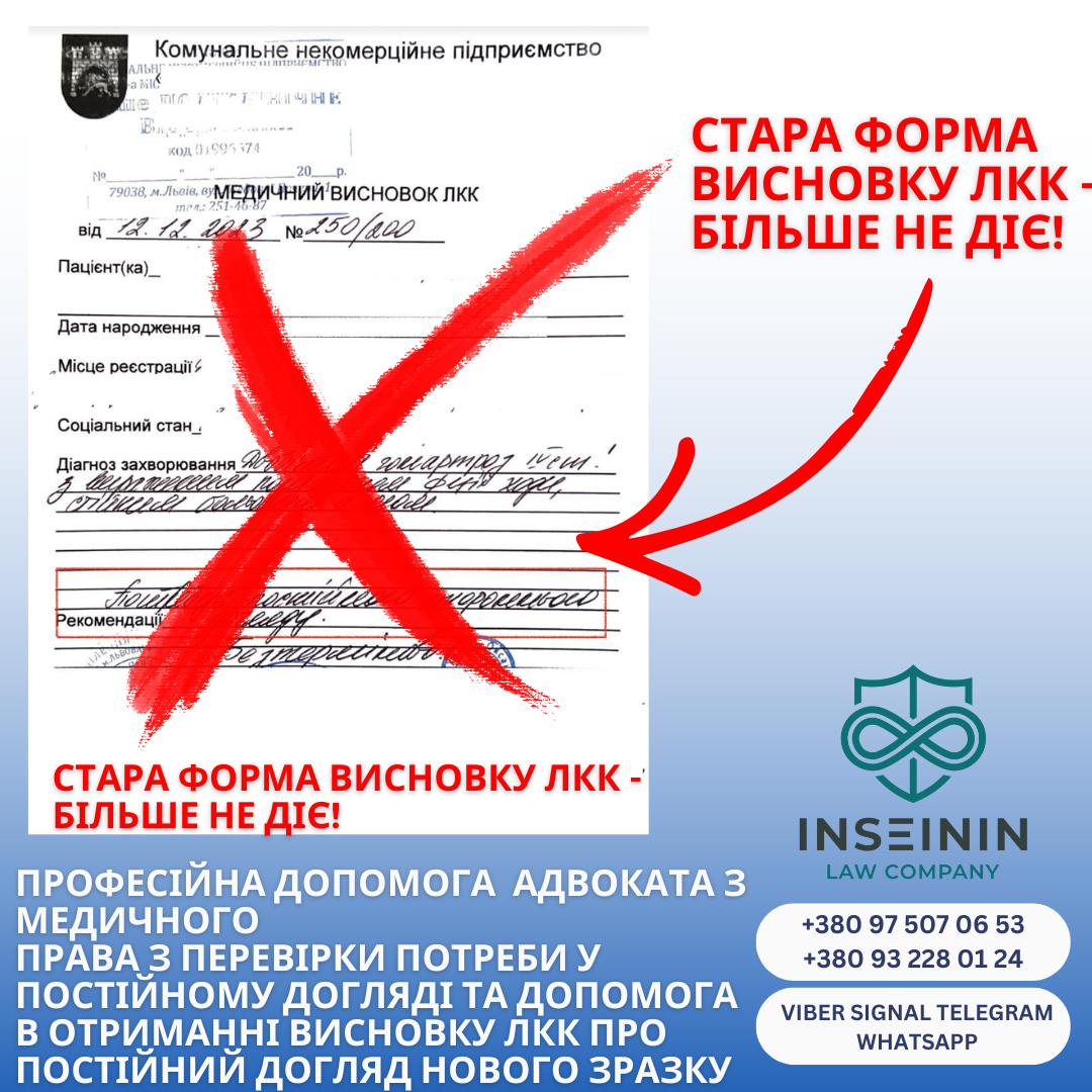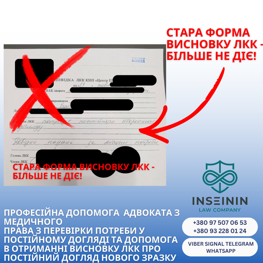 У цій статті ми, як фахівці з медичного права з Юридичної компанії INSEININ, розберемо ключові аспекти нової форми: хто і як її видає, порядок отримання, строки дії, адже наші медичні спеціалісти разом з адвокатами, також щодня допомагають перевіряти наявність підстав для отримання висновку ЛКК про потребу постійного догляду за новою формою і так само як і раніше оскаржувати відмову якщо вам відмовляють у видачі такого висновку.