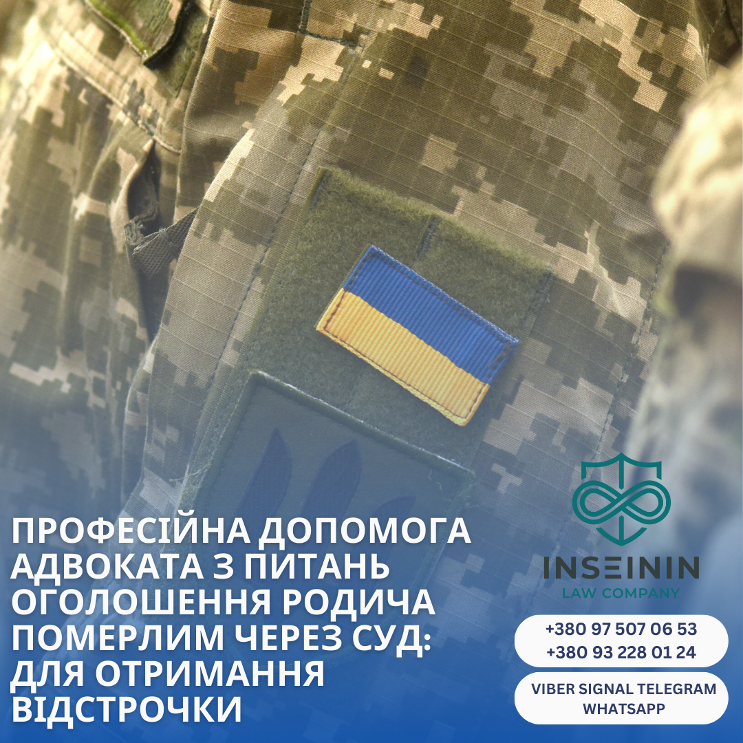 Объявление физического лица умершим (ст. 46 ГК Украины). Применяется, если человек пропал без вести, и прошло определенное время (общее правило — 3 года, но для ситуаций, связанных с военными действиями — через 6 месяцев после исчезновения, или не ранее истечения 6 месяцев после завершения военных действий, в зависимости от обстоятельств и доказательной базы). Нюанс: Это более долгий путь, но необходимый для целей получения отсрочки.