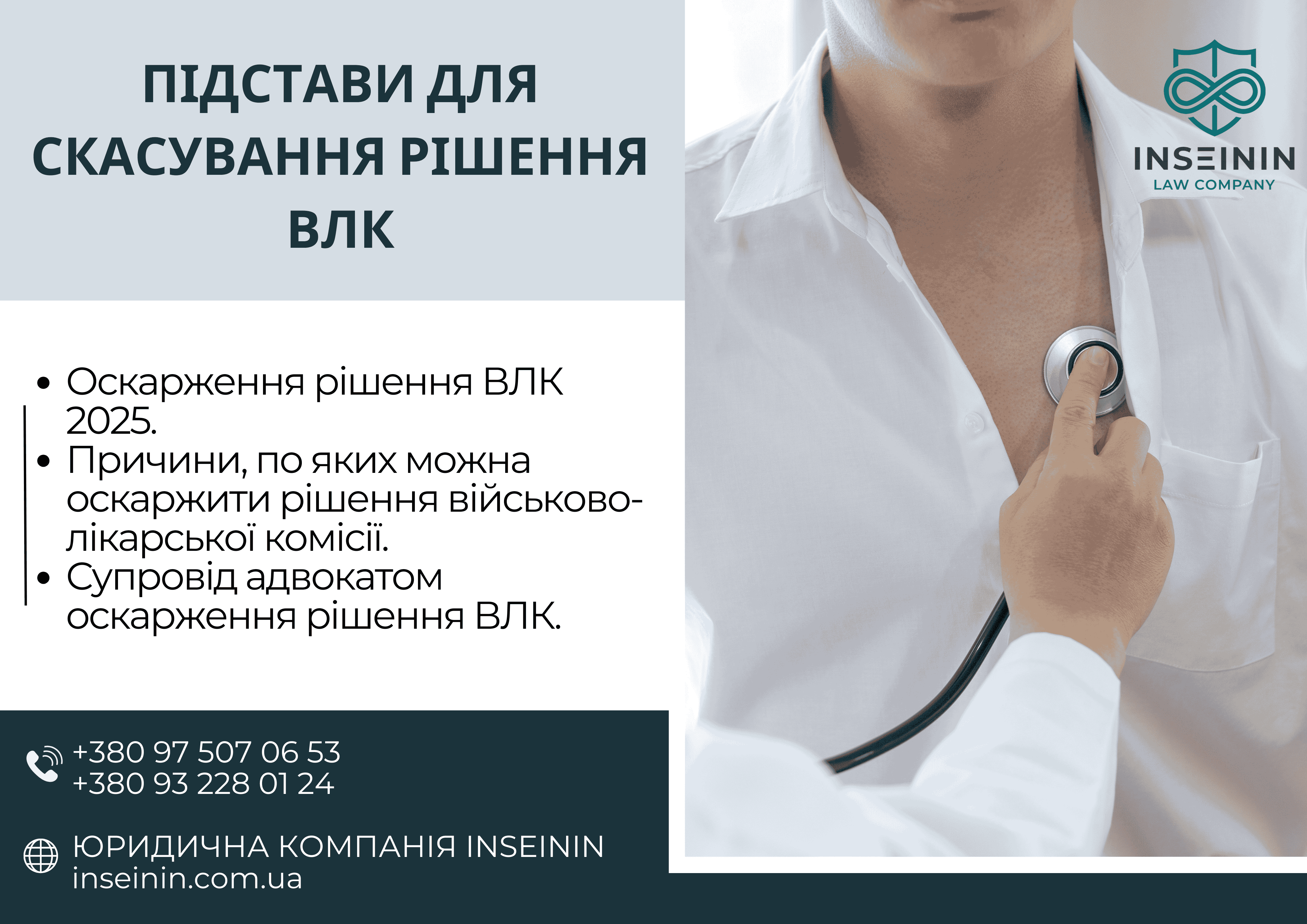- Зверніться за допомогою до профільних юристів або адвокатів з даних питань (ЮК INSEININ), які можуть перевірити документи та встановити наявність підстав для оскарження рішення ВЛК. Якщо підстави наявні, адвокат може здійснювати повний супровід справи.