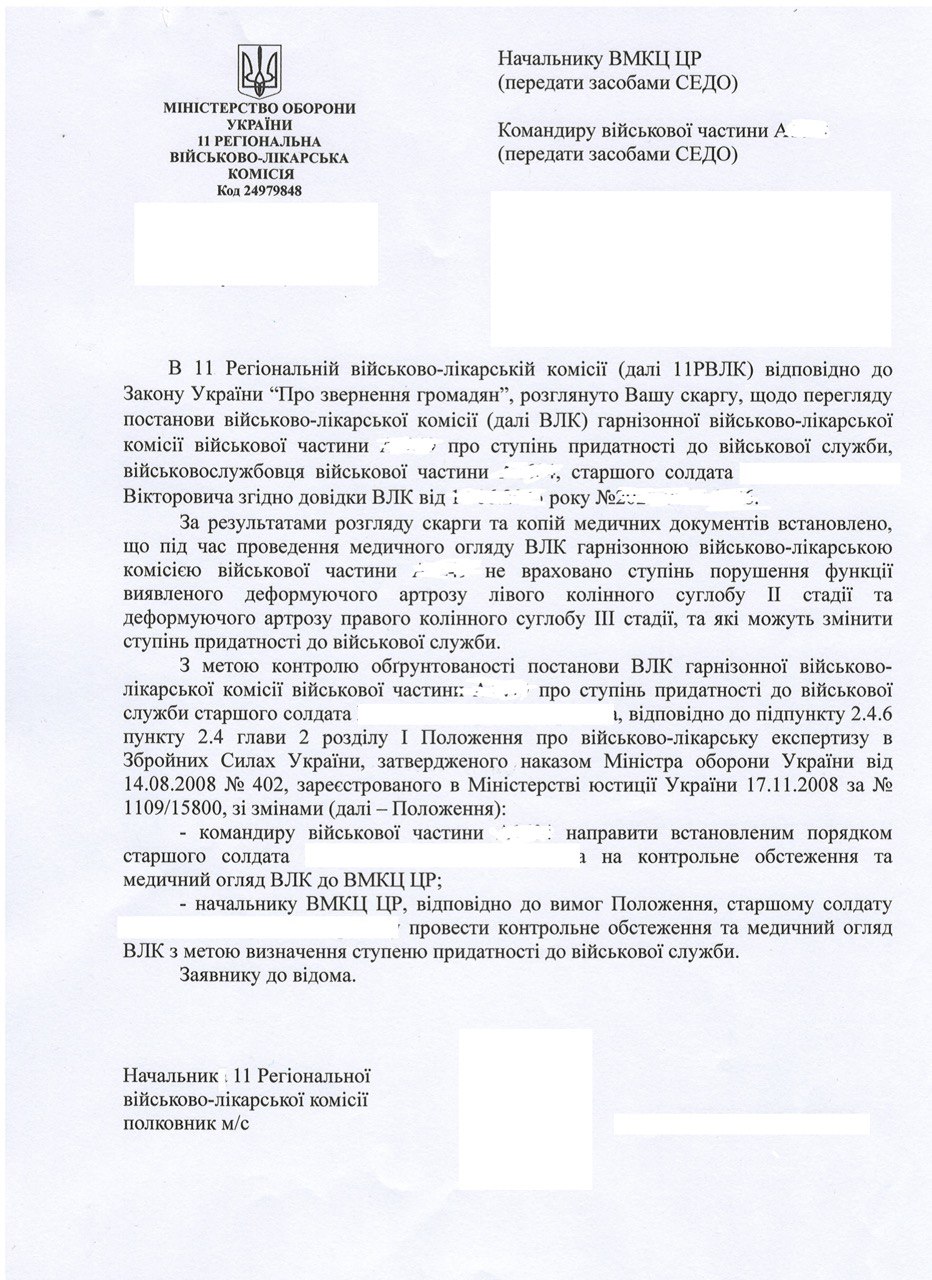 На цій підставі медичним адвокатом було підготовлено всі необхідні документи для скасування незаконного рішення ВЛК та направлення військовослужбовця на повторний перегляд. Скарга разом з документами була направлення на розгляд до 11 Регіональної ВЛК.