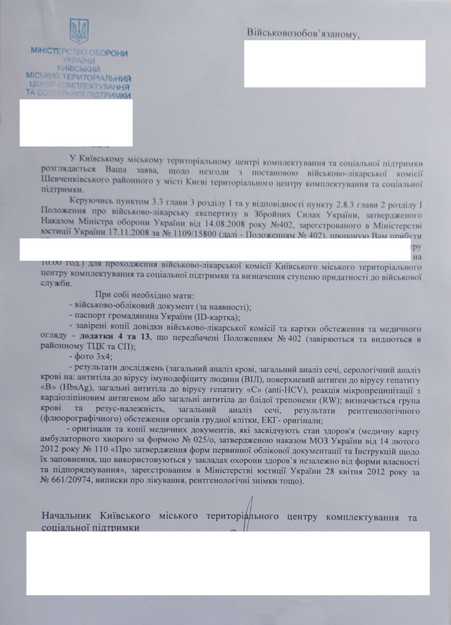 Наказом Міністра оборони України від 14.08.2008 року Nº402, зареєстрованого в Міністерстві юстиції України 17.11.2008 за Nº 1109/15800 (далі - Положенням Nº 402), пропоную Вам прибути до Київського міського територіального центру комплектування та соціальної підтримки для проходження військово-лікарської комісії Київського міського територіального центру комплектування та соціальної підтримки та визначення ступеню придатності до військової служби.